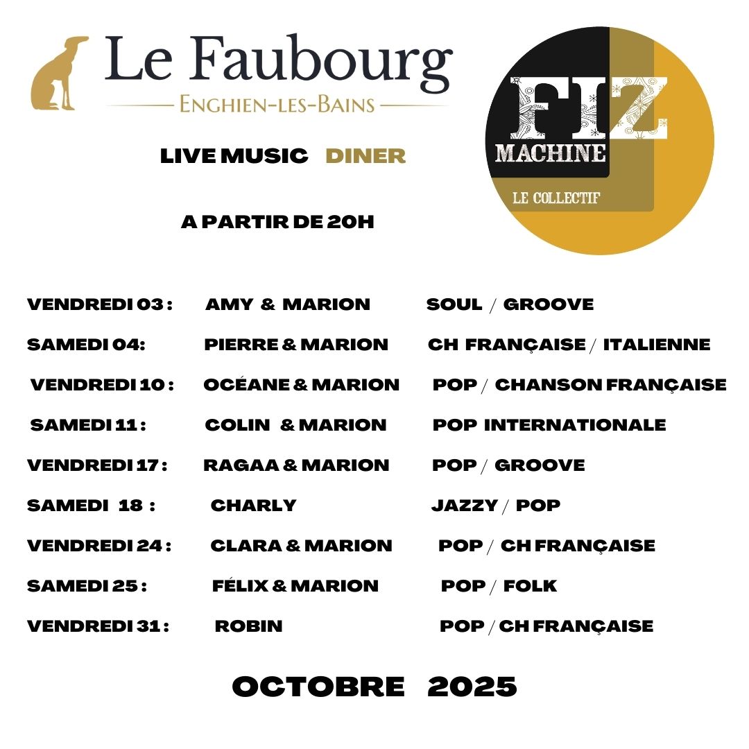 Réservez dès maintenant votre table pour le Live Music Diner avec Fiz’Machine au Restaurant Le Faubourg de ENGHIEN LES BAINS et préparez-vous à vivre une soirée pleine de bonne humeur.